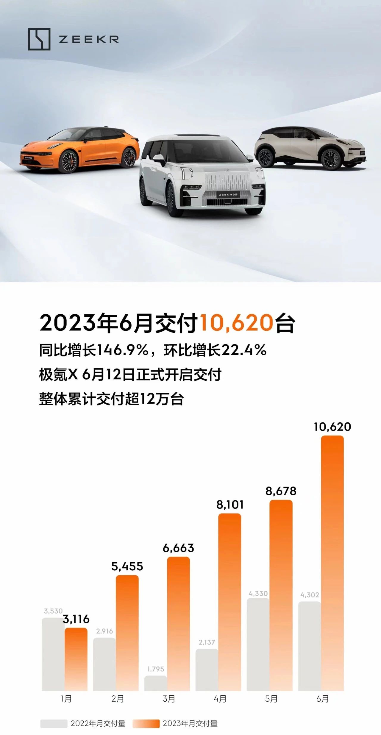 极氪的销量也算是突破了自我,新的轻奢车型极氪 X 有望给极氪带来更多的销量。极氪品牌6月交给10620辆,同比增加146.9%,环比增加22.4%,是仅有一个接连5个月同、环比正增加的奢华纯电品牌。6月28日,极氪001联袂新奢万能SUV极氪X在欧洲敞开预售。历经全球体量最大、最苛刻商场的检测,这对极具立异价值的产品组合,也将为欧洲用户带来逾越等待的奢华纯电出行体会。