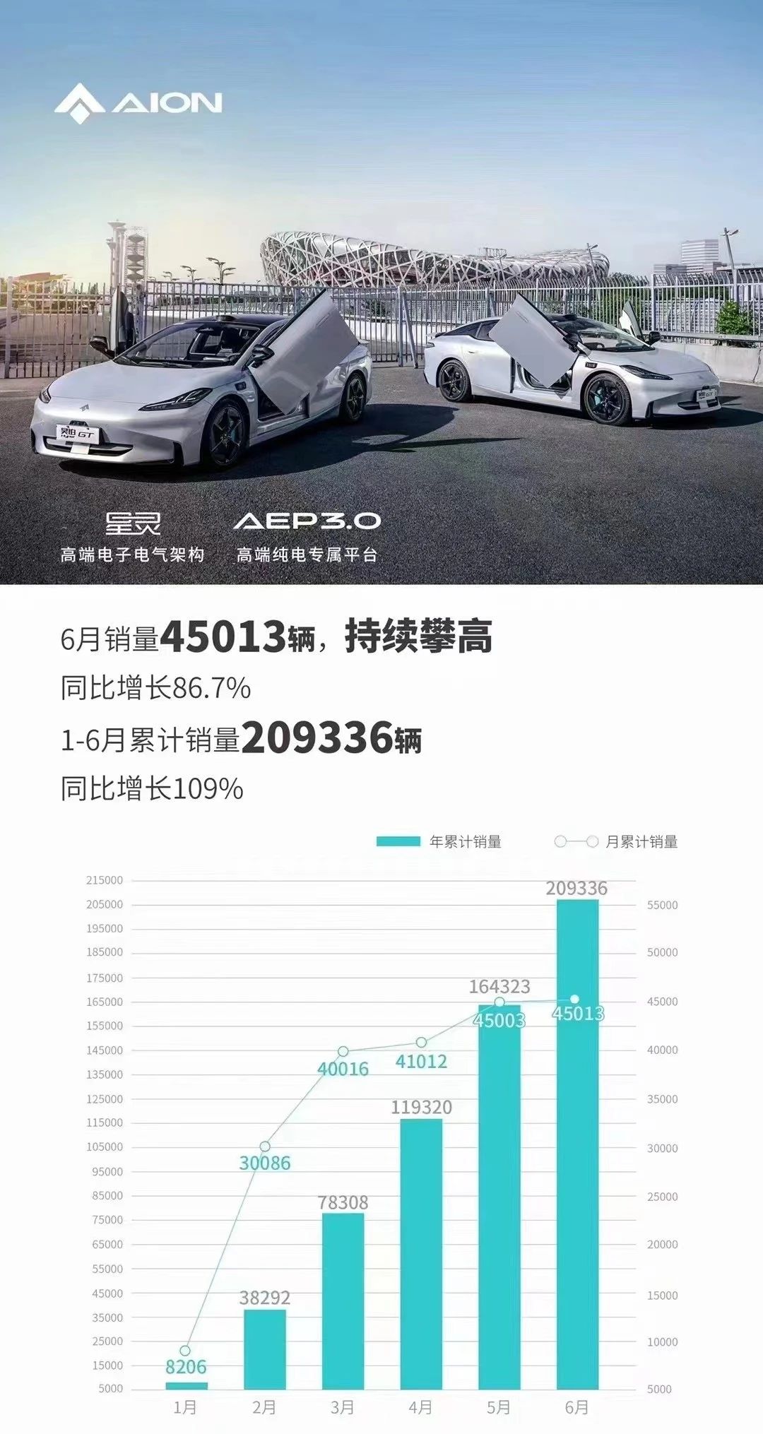 广汽埃安宣告,6月公司销量45013辆,同比增加86.7%。广汽埃安旗下高端品牌昊铂第二款车型Hyper GT将上市,由此进入“埃安+昊铂”双品牌运营。新车根据全新一代纯电专属渠道AEP 3.0打造而来,一起也是昊铂系列首款搭载星灵架构的车型。一起本年1到6月累计销量 算计209336辆,同比增加 109%。